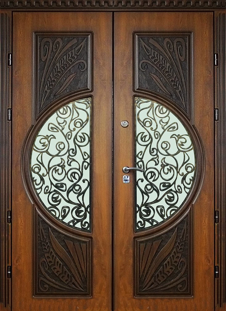 Поскольку в большинстве случаев устанавливаемые на входе в коттедж двустворчатые двери являются еще и предметом интерьера, украшающим здание, их дизайну предается особое значение. Эти двери, как правило, отделываются атмосферостойким МДФ, натуральным шпоном, массивом. Эффектно на таких дверях смотрится витражный узор, применение ковки, зеркальных элементов. Вариантов декора входной двустворчатой двери масса, тут все зависит от пожеланий заказчика.